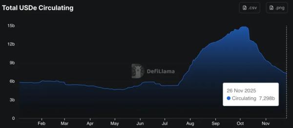 Рыночная стоимость синтетической «стабильной монеты» USDe от проекта Ethena обвалилась на 50% за месяц — с $14,8 млрд в октябре до текущих $7,2 млрд. Источник: DefiLlama. При этом реальное использование монеты