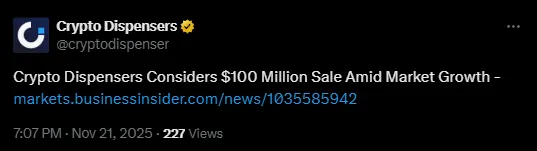 Американский оператор биткоин-банкоматов Crypto Dispensers рассматривает возможность продажи бизнеса за $100 млн. Сообщения появились после обвинения основателя компании в отмывании денег. 21 ноября фирма из Чикаго опубликовала пресс-релиз, в котором